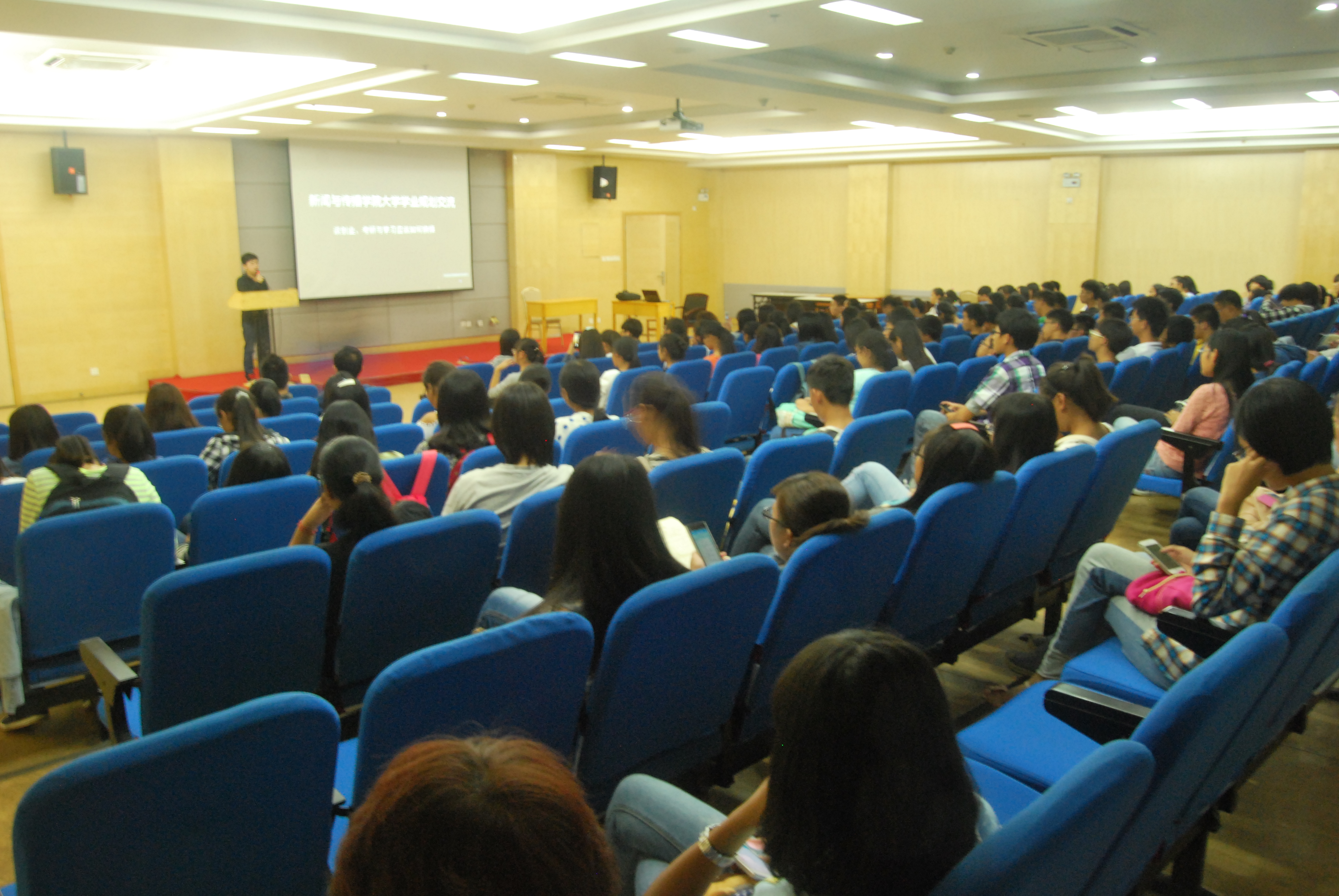 四位学长学姐分别介绍了自己大学学业规划,给大一同学们分享了自己独特的经历。崔俊毅媒介Q1041班,曾任学生会主席,现就读于华中师范大学新闻专业研究生。崔俊毅根据自己的考研经历,从学习,学生会,老师三个方面与同学们进行交流。叶梦莹传播Q1141班,去美国社会实践《抵达美帝的天空》分享了再美国三个月的见闻和感受。