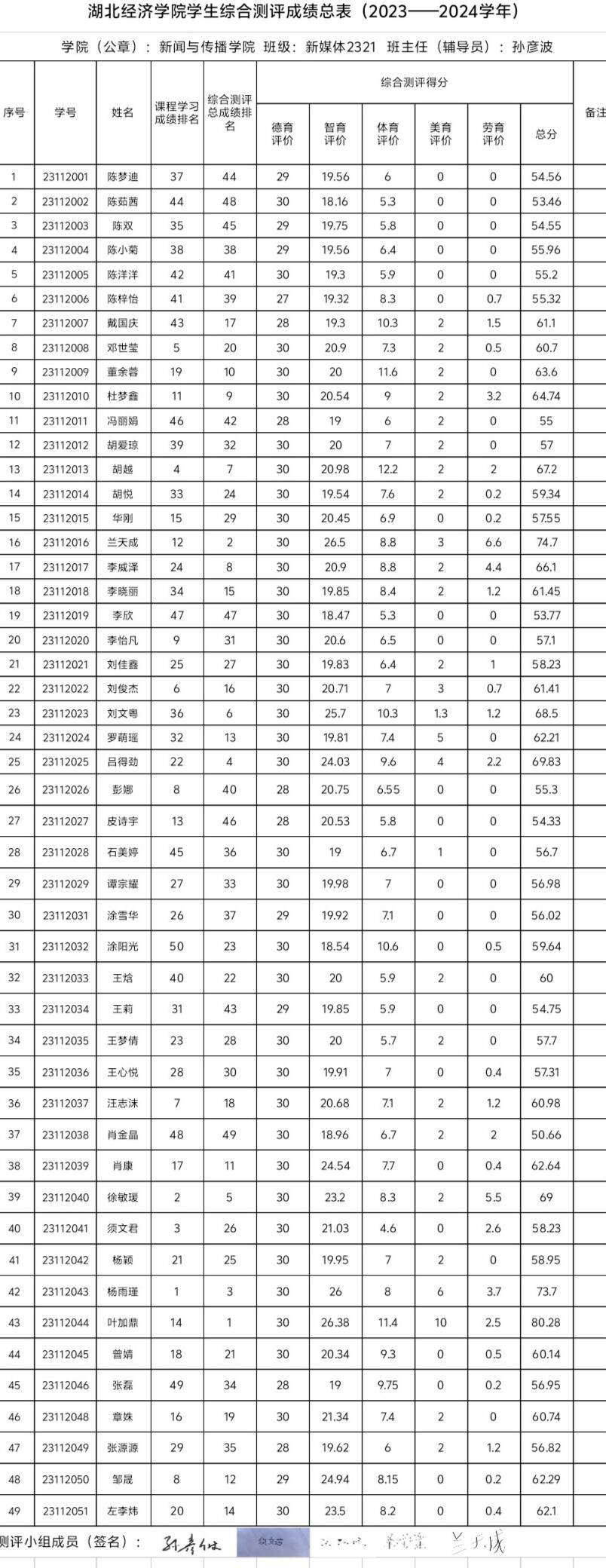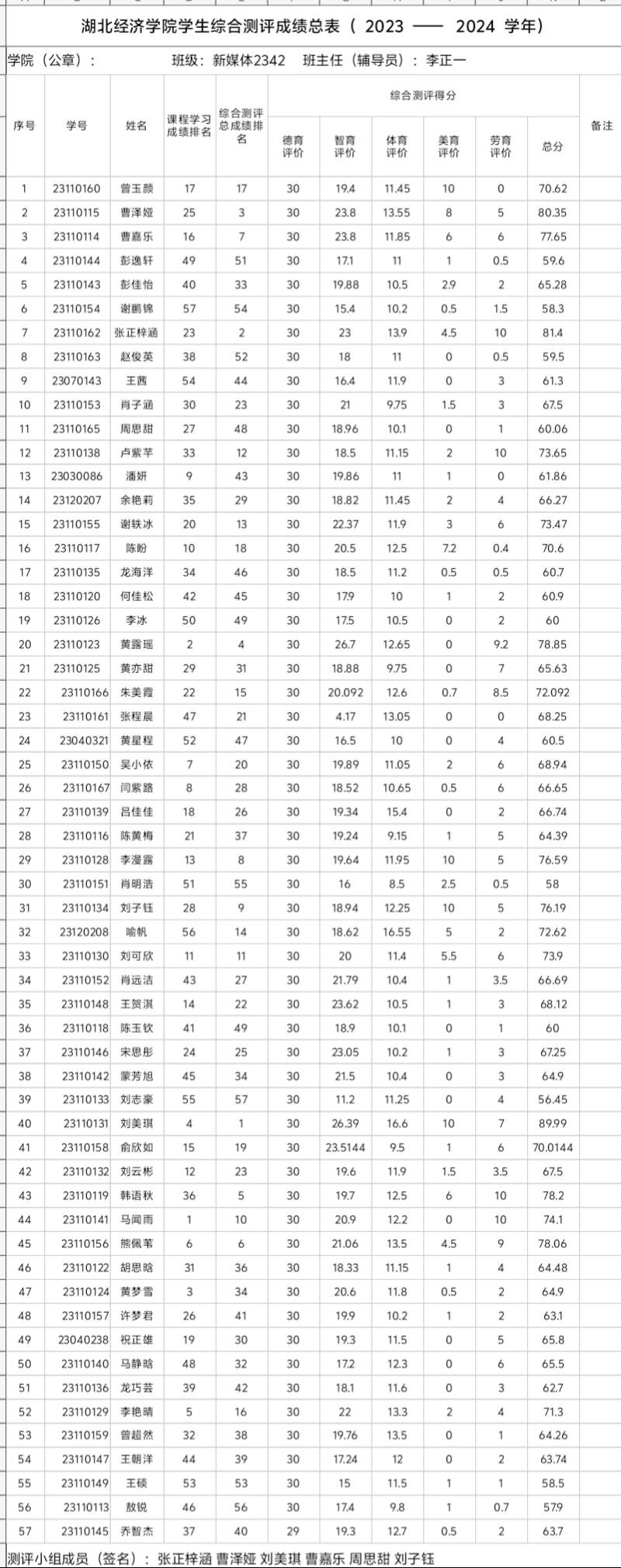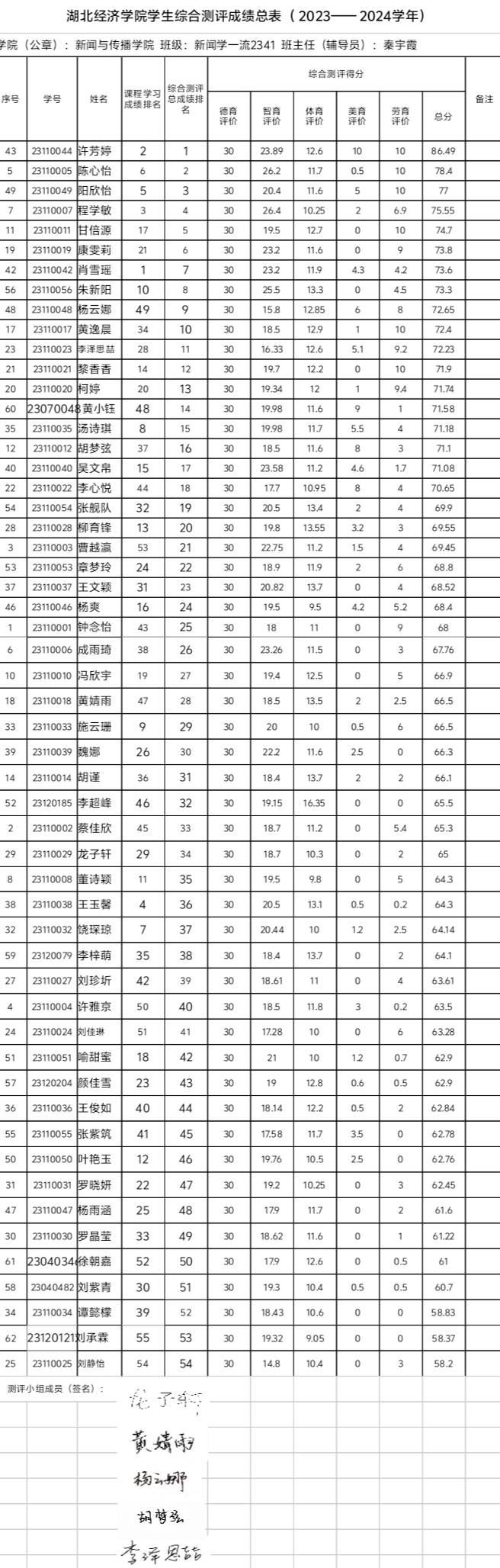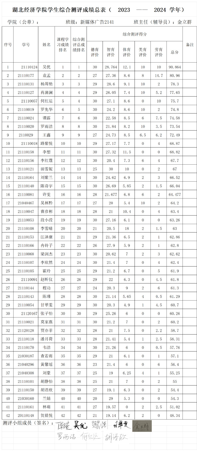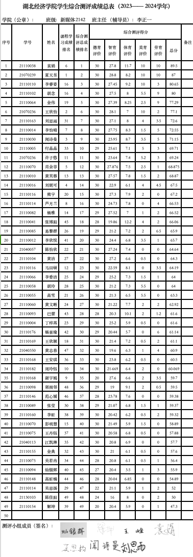 根据《tyc33455cc太阳成集团本科学生奖励办法》、《tyc33455cc太阳成集团本科学生综合素质测评办法》等有关规定,经个人自评、班级评议小组集体评议、学院审核、班级公示,现将班级综测及先进个人评选结果进行公示,具体名单如下: