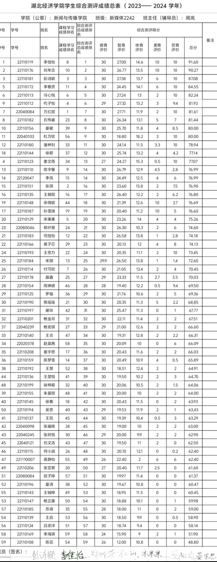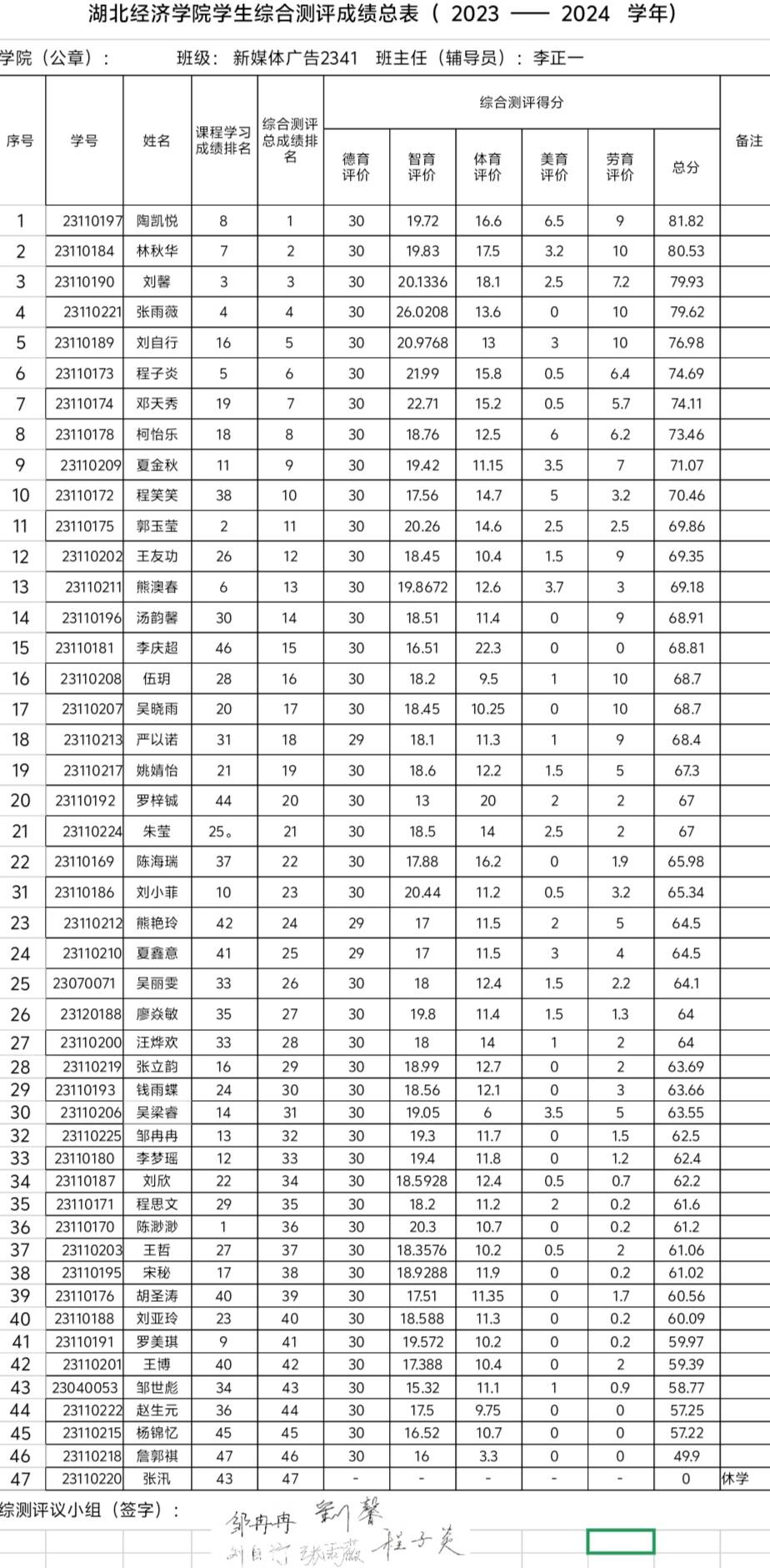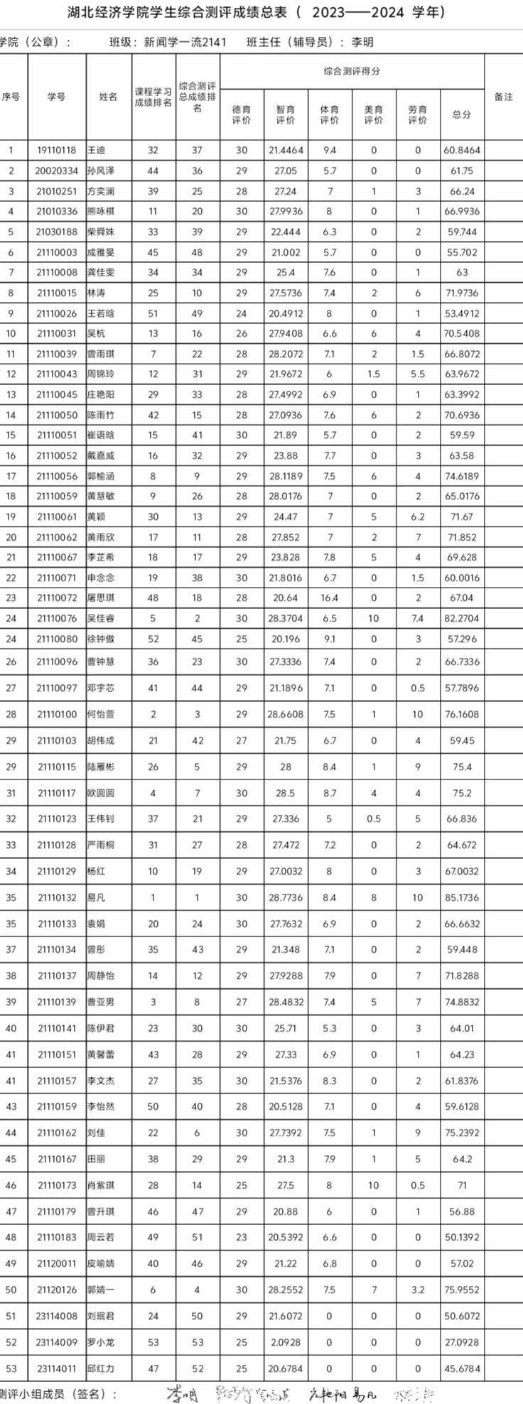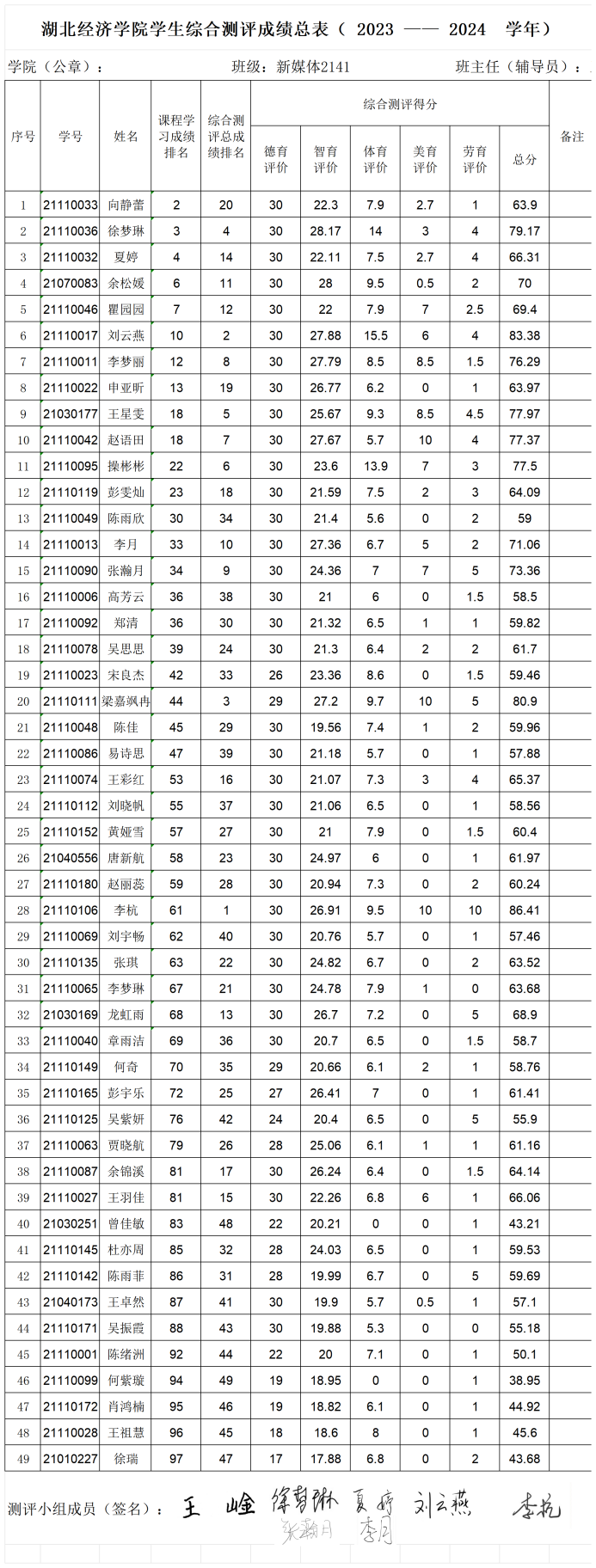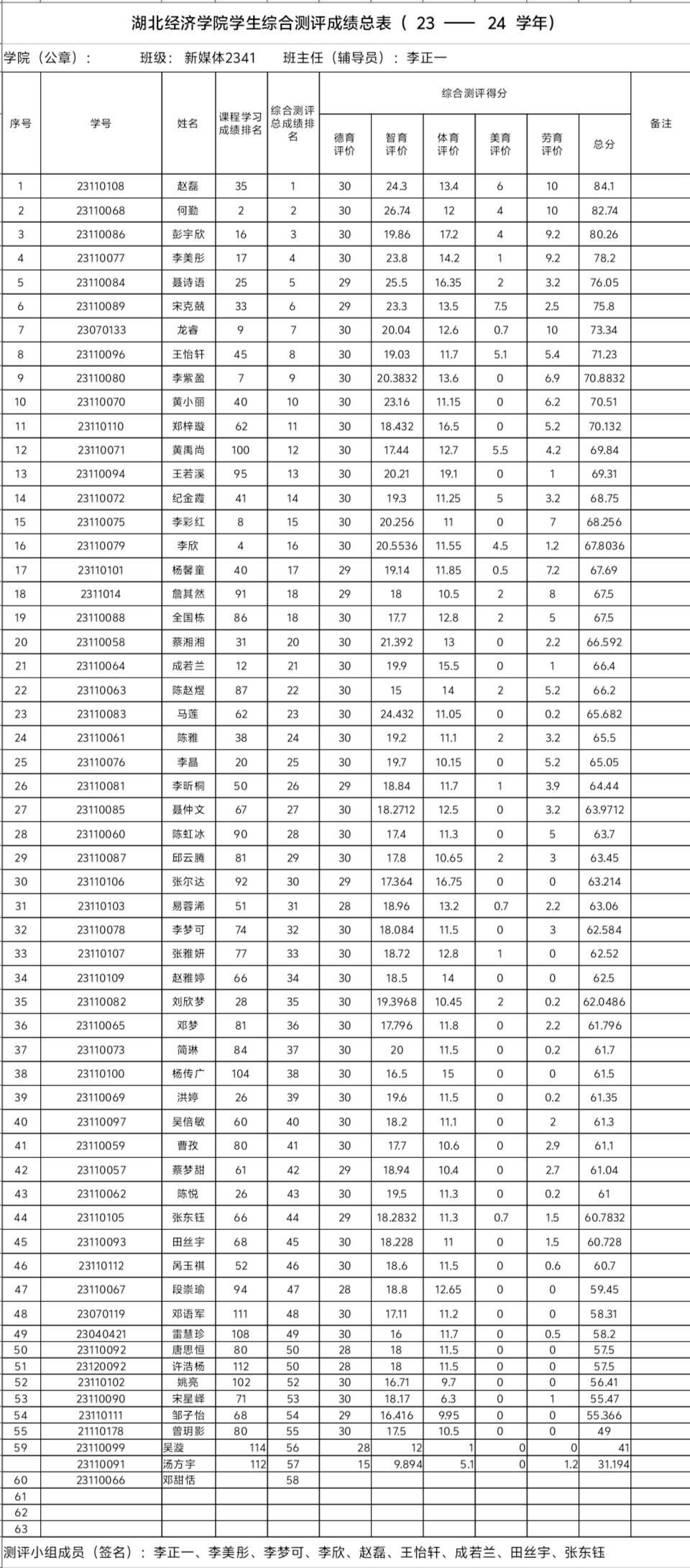 根据《tyc33455cc太阳成集团本科学生奖励办法》、《tyc33455cc太阳成集团本科学生综合素质测评办法》等有关规定,经个人自评、班级评议小组集体评议、学院审核、班级公示,现将班级综测及先进个人评选结果进行公示,具体名单如下: