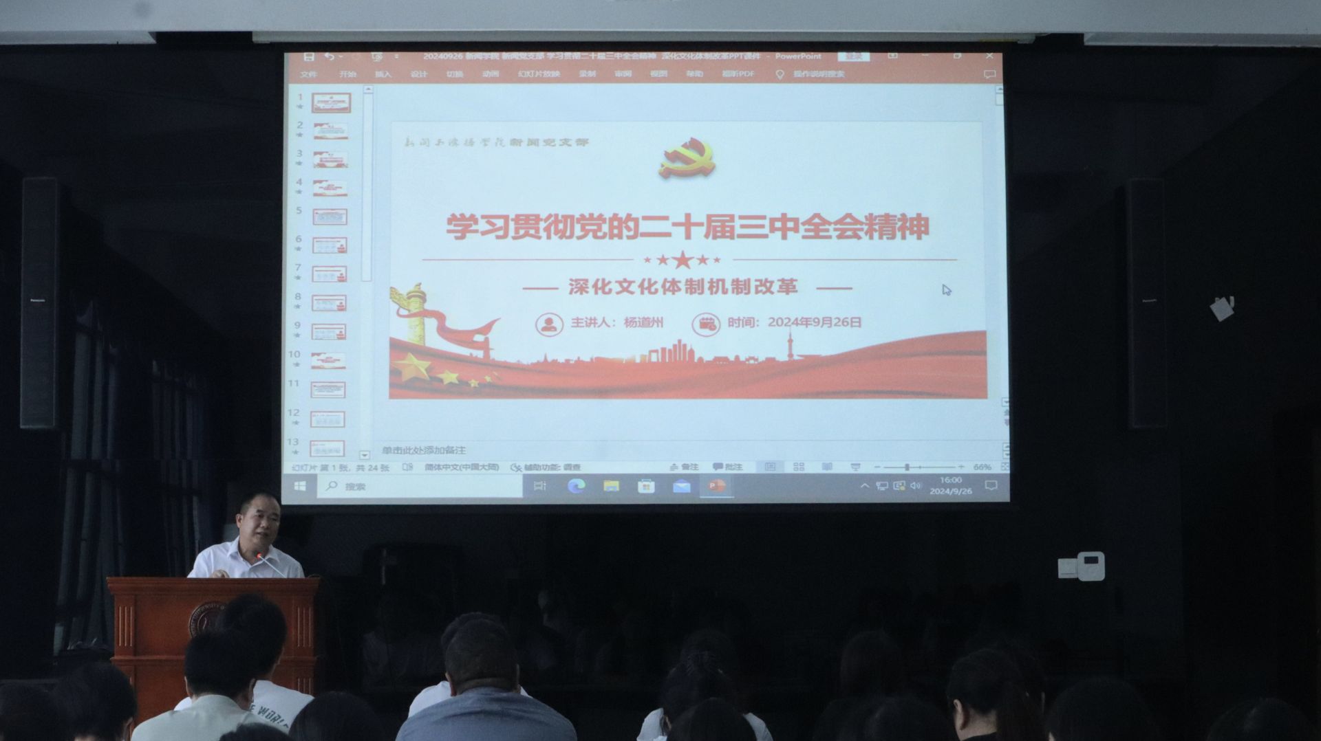 新闻党支部杨道州老师围绕“学习贯彻党的二十届三中全会精神 深化文化体制机制改革”主题讲授党课。他谈到,大家要充分认识深化文化体制机制改革重大意义,当今世界百年未有之大变局加速演进,文化越来越成为综合国力竞争的重要力量;中华民族伟大复兴进入关键时期,文化越来越成为强国建设、民族复兴的强大支撑。他勉励学生党员们,要立足自身专业,在深化文化体制机制改革的进程中,大胆实践、勇于创新;要敢于突破传统思维模式和束缚,积极探索新的报道方式、传播手段和服务模式;多关注社会热点和民生问题,深入挖掘新闻背后的故事和价值。