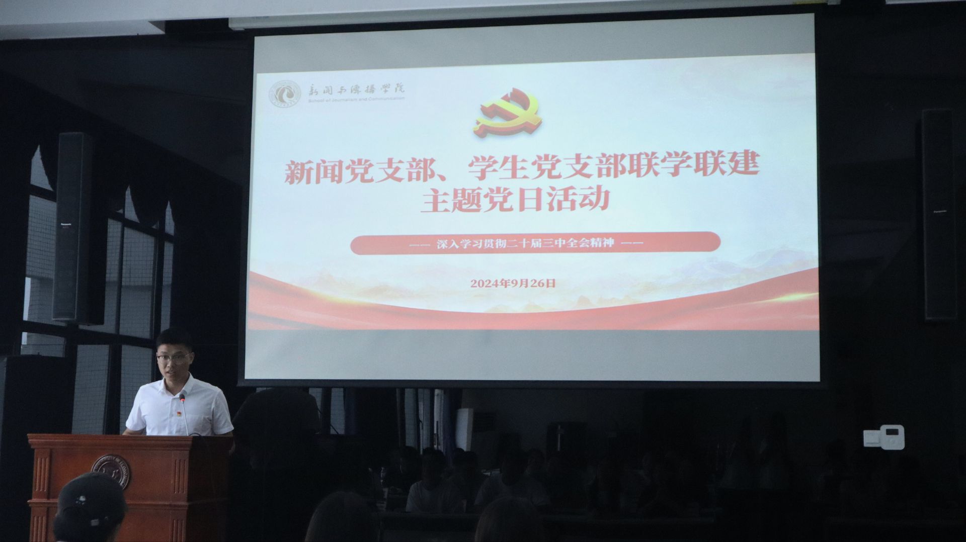 为深入学习贯彻党的二十届三中全会精神,凝聚师生共识,2024年9月26日下午,太阳集团tyc33455新闻党支部、学生党支部开展联学联建9月主题党日活动,学生党支部书记卢翔老师主持,新闻党支部、学生党支部全体师生党员参加。