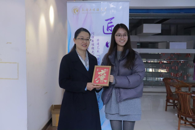 学生代表向王栎书记(左)赠送廉洁箔画作品