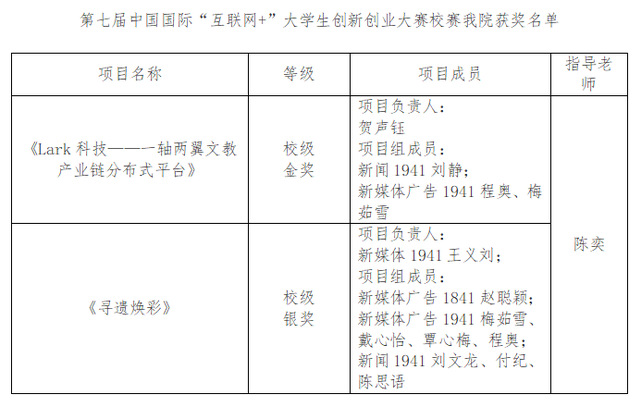 本网讯(通讯员 付纪) 9月23日,学校正式公布了第七届中国国际“互联网+”大学生创新创业大赛校决赛的获奖名单。我院陈奕老师指导的两个项目分别获得校级金奖与银奖,取得省级比赛的资格。两个项目共有包括我院王义刘在内的10名同学参与。