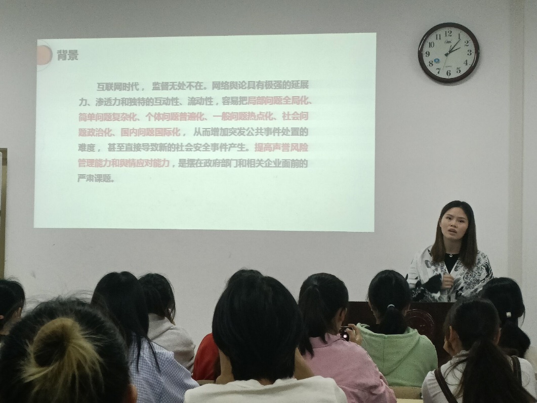 江老师首先从网络舆情的产生背景谈起,她认为在互联网时代,网络舆论具有极强的延展力、渗透力,提高舆情管理与应对能力,是政府和企业部门面临的严肃课题。她同时强调