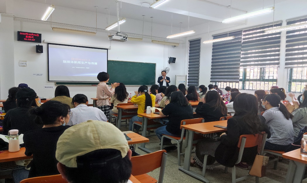 本网讯(通讯员 刘洋洋) “技术要与时俱进地学,但作为学生,传统写作更重要!”“五•四”青年节当天,从新闻1941班《影视传播学》课堂不时传来铿锵有力的话语声和热烈的掌声。应任课教师陈奕的邀请,我院特聘产业导师、湖北广电长江云编辑部主任邓国辉走进课堂,作了主题名为“跃进web3.0:融媒体新闻生产与传播”的讲座。据悉,此次讲座属于我院业界师资进课堂系列活动之一。